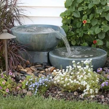The Spillway Bowl and Basin Fountain Kit: An all-in-one, easy-install recirculating fountain. Durable GFRC bowl and basin created an elegant, multi-step look. Includes AquaBasin 30 sub-surface HDPE reservoir (27 gal/102 L, lifetime warranty), an energy-efficient Ultra 800 pump, and all pipe/fittings for simple setup.