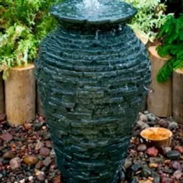 The Stacked Slate Urn 33.5″H Fountain Kit includes everything you need to install a beautiful urn fountain in just a couple of hours. Simply add water and small stones or mulch to conceal the top of the basin. The lightweight, durable fiber-resin composite construction looks amazingly like stone but is less expensive.